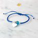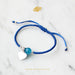 Pulsera de Plata, tejida en hilo con diferentes dijes y acompañada de una piedra Ágata azul.